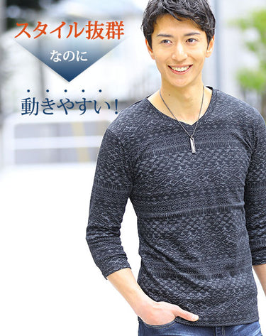 柄物ですがうっすらなので無地のように着こなしやすく、男らしい雰囲気のあるTシャツになっています。