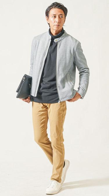 40代メンズ全身3点コーデセット グレー長袖ジャケット×黒長袖Tシャツ×カーキストレッチチノパンツ