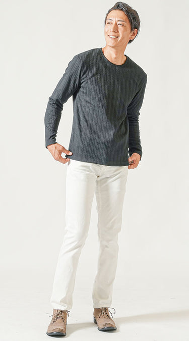 50代メンズ全身3点コーデセット グレー長袖ジャケット×黒長袖Tシャツ×白ストレッチチノパンツ