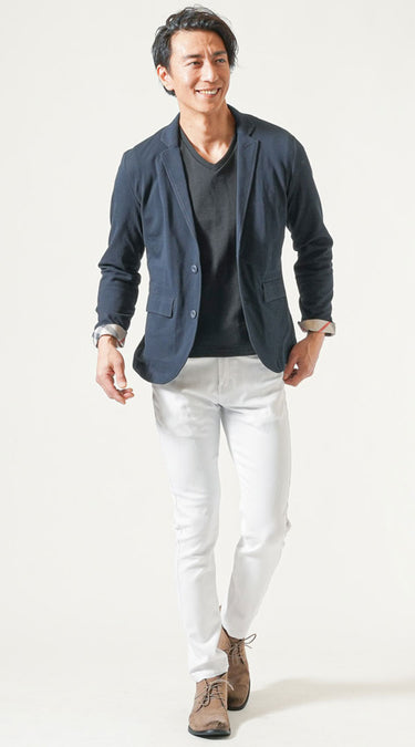 黒Tシャツは、白Tシャツに比べて引き締まった印象になり、ジャケットスタイルもかっこよく決まります。