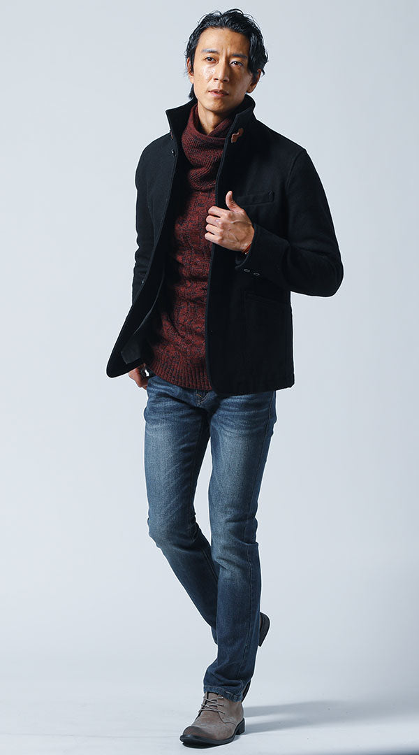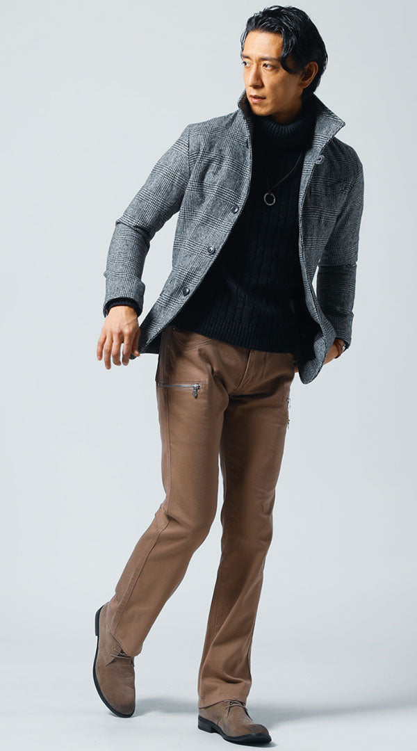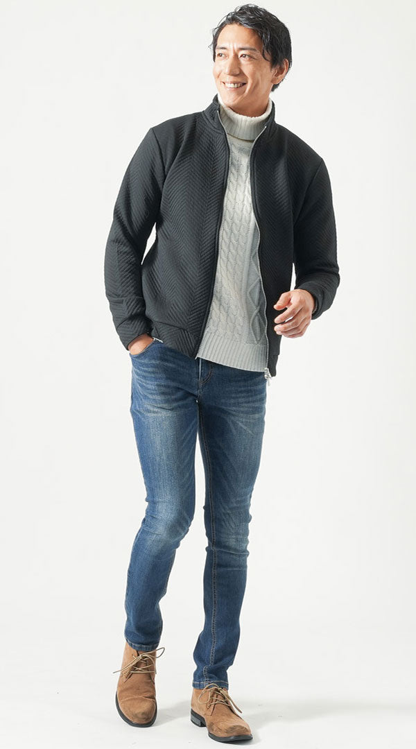 立ち襟のアウターは顔回りをスッキリさせて小顔に見える効果があるので、「タートルネックは顔が大きく見えそうで不安・・・」そんな男性にもおすすめの組み合わせです。