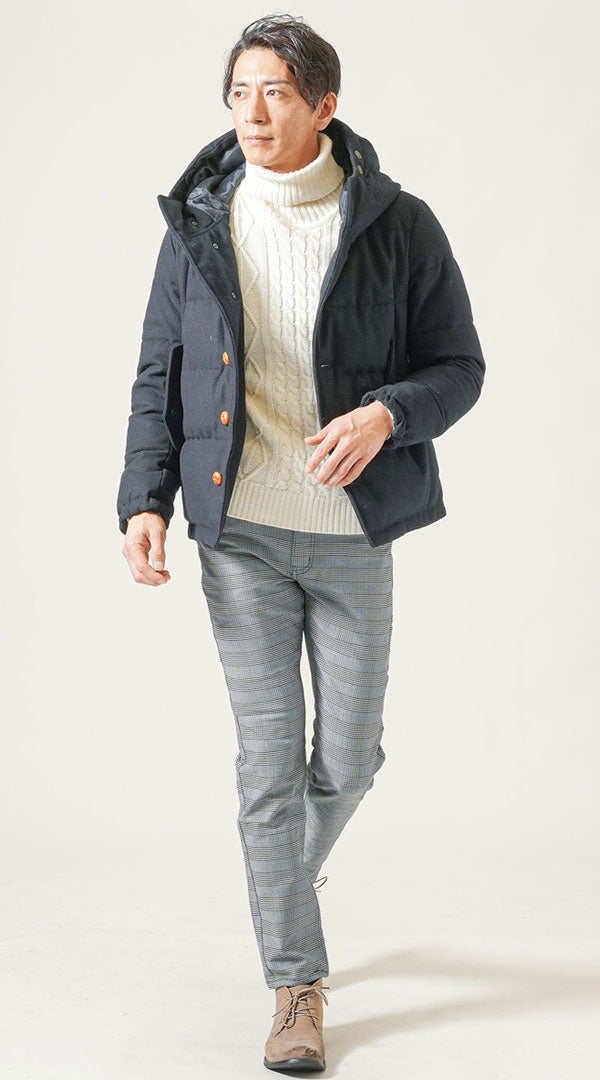 50代メンズ冬服全身3点コーデセット ネイビー中綿ダウンジャケット×白タートルネックニット×グレーチノパンツ