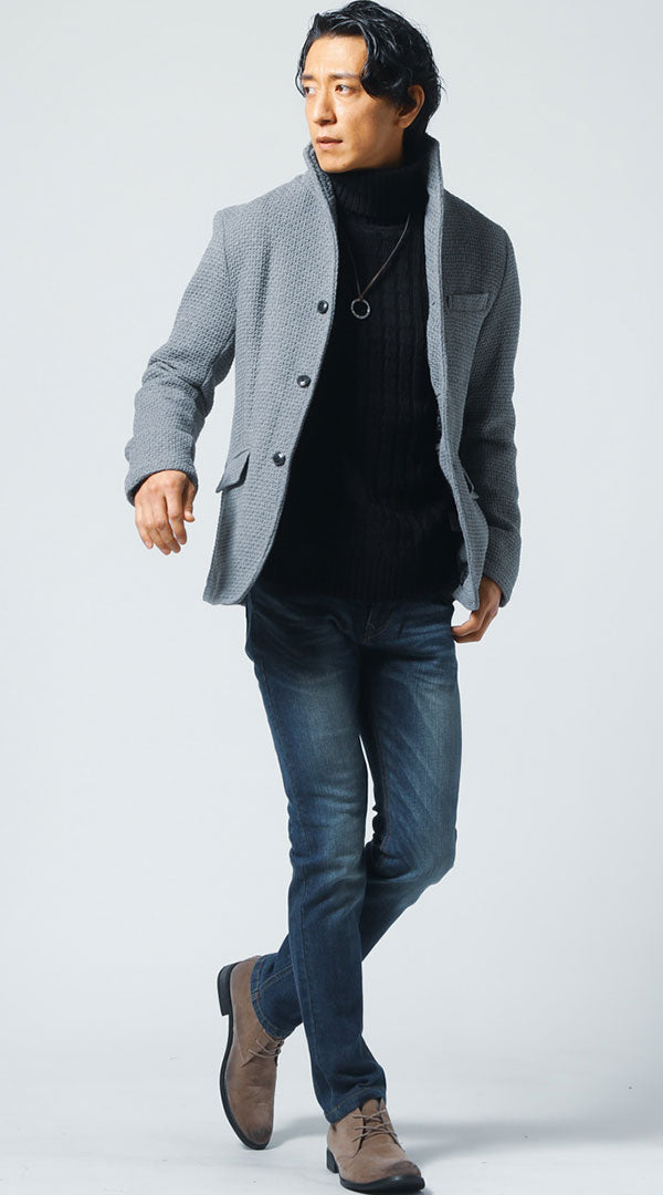 グレーの立ち襟ジャケットと黒のタートルネックニットがスタイリッシュな雰囲気のメンズコーデ。