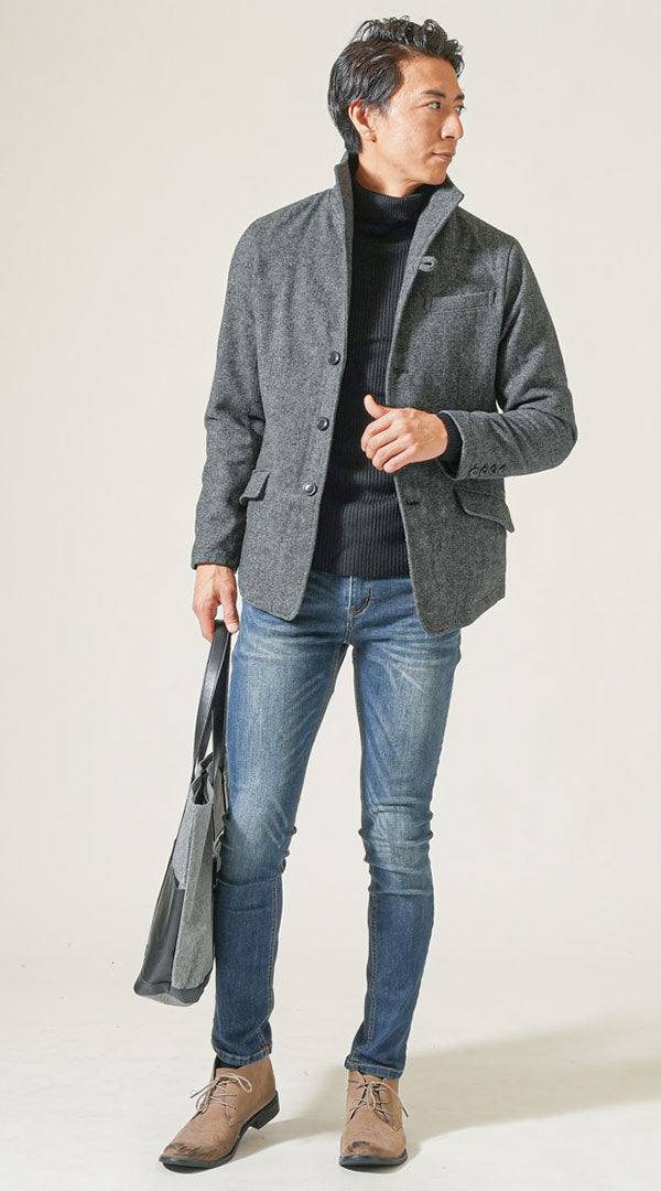 キレイめジャケットとタートルネックの組み合わせで、上品さとあったかさが生まれ、50代男性にぴったりです。