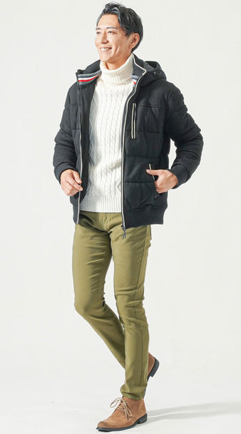 40代メンズ冬の3点コーデセット 黒中綿ダウンジャケット×白タートルネックニット×ベージュスリムチノパンツ
