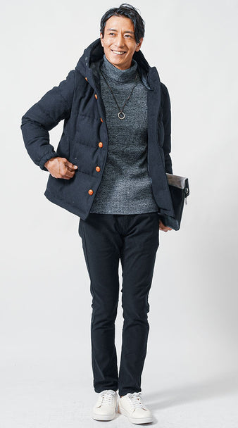 ネイビーのダウンと黒パンツを合わせたシックな着こなし。インナーに中間色であるグレーニットを入れることで重たくならずに大人な雰囲気の着こなしを楽しむことができます。