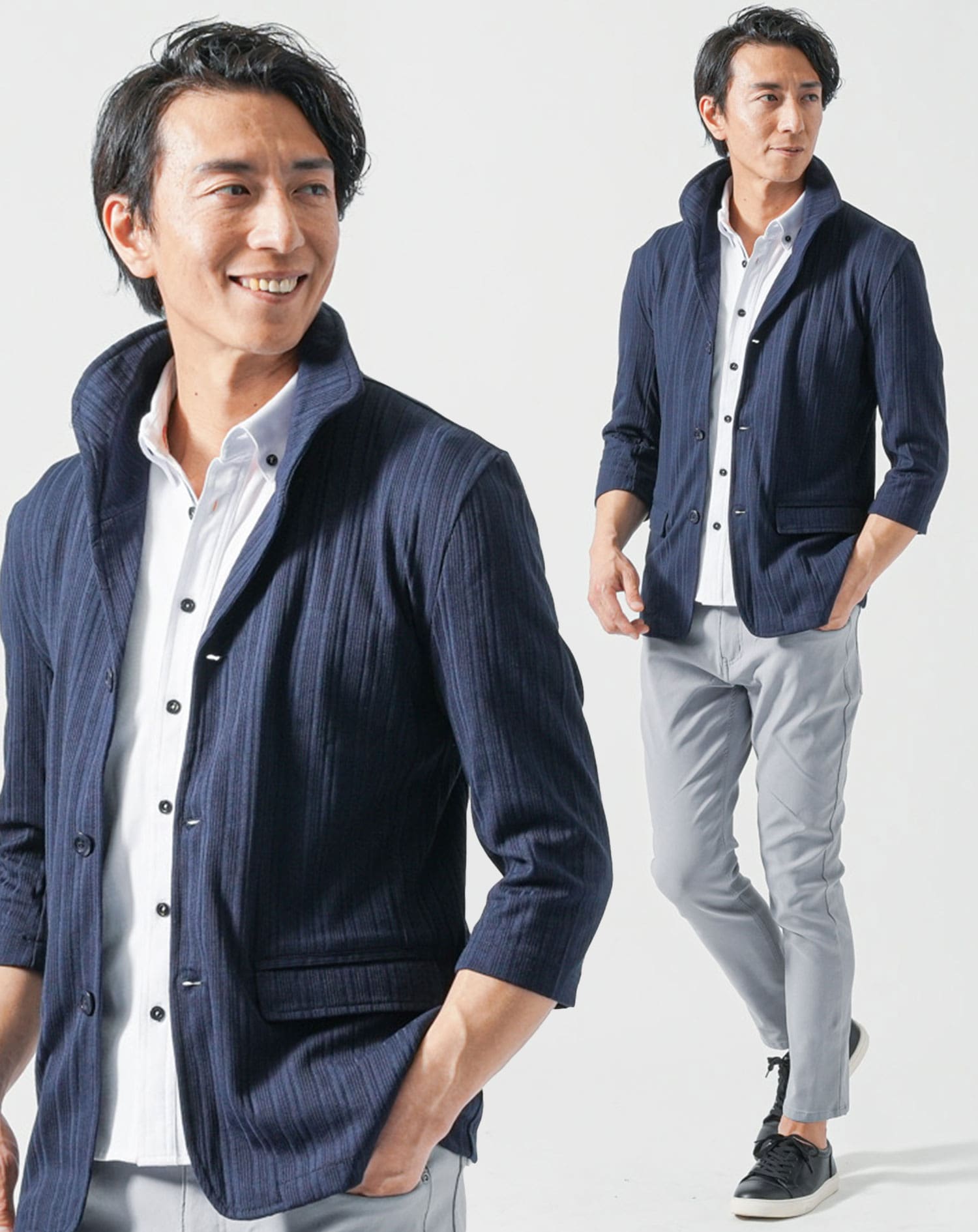 春・夏・秋と3シーズン活躍してくれる細身な7分袖のイタリアンスタンドカラージャケットです。凹凸のある膨れストライプ生地を使う事で、無地にはない上品かつ大人な雰囲気を作ってくれます。シンプルなインナーと合わせるだけでオシャレなきれいめスタイルが完成。