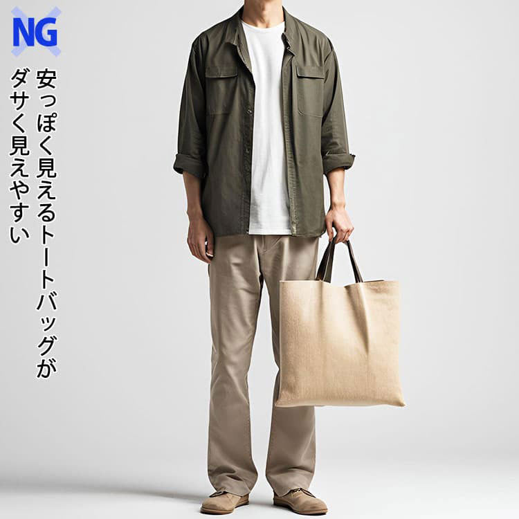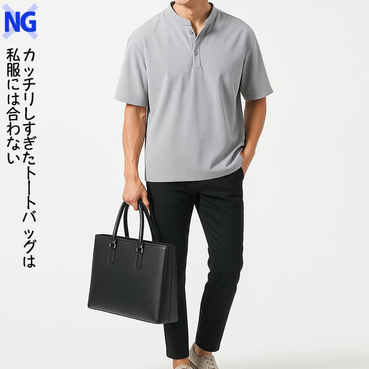 ■私服にカッチリしたトートバッグを持ったダサく見えるNG例