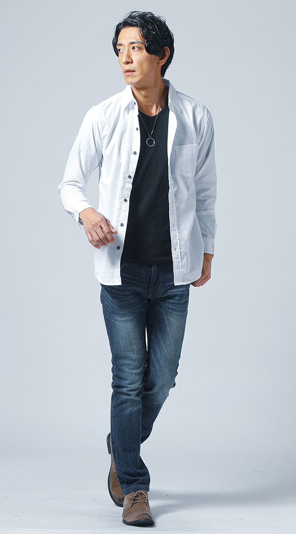 メンズ白シャツ×デニムパンツのおしゃれな大人コーデ&おすすめアイテムを紹介白シャツ×デニムパンツが似合う男性になってみませんか?おしゃれに着こなすコツを教えます