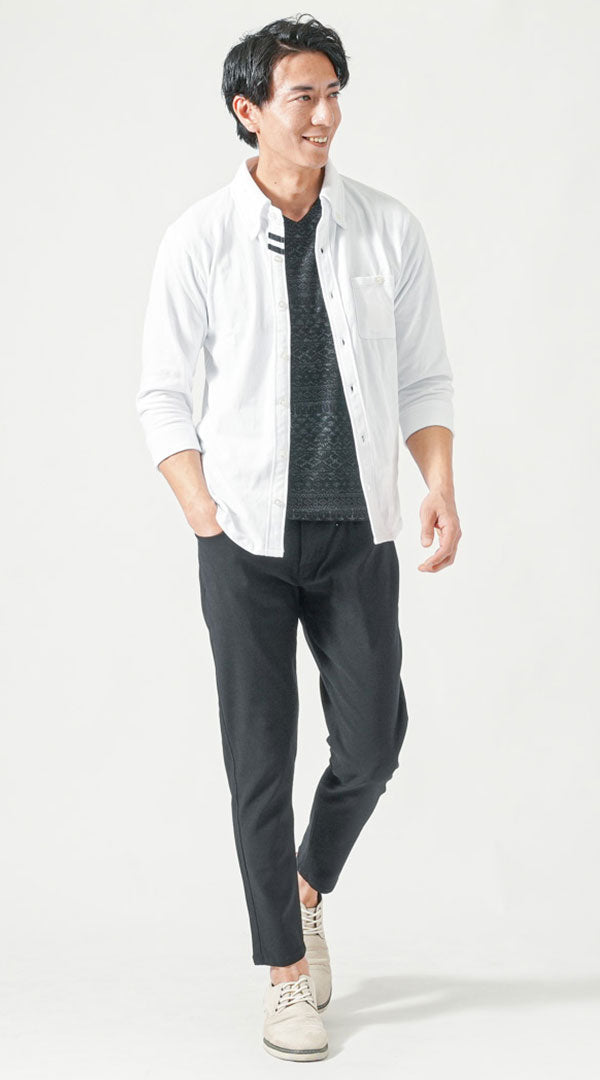 シンプルな白シャツに無地の黒カットソーを合わせることで、清潔感の中に芯のある印象を演出できます。