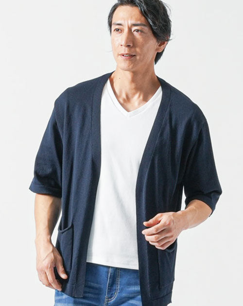 ネイビーのVネックTシャツと白パンツの組み合わせが爽やかさを引き立てる夏コーデ。色彩理論上、暗色のネイビーと高明度の白は明度差が大きく、視覚的なメリハリが強調される好相性の組み合わせ。半袖カーディガンの軽やかな羽織りがこなれ感をプラスし、全体を季節感たっぷりに演出。ネイビーに合うズボンの中でも、夏に映える王道の色合わせです。