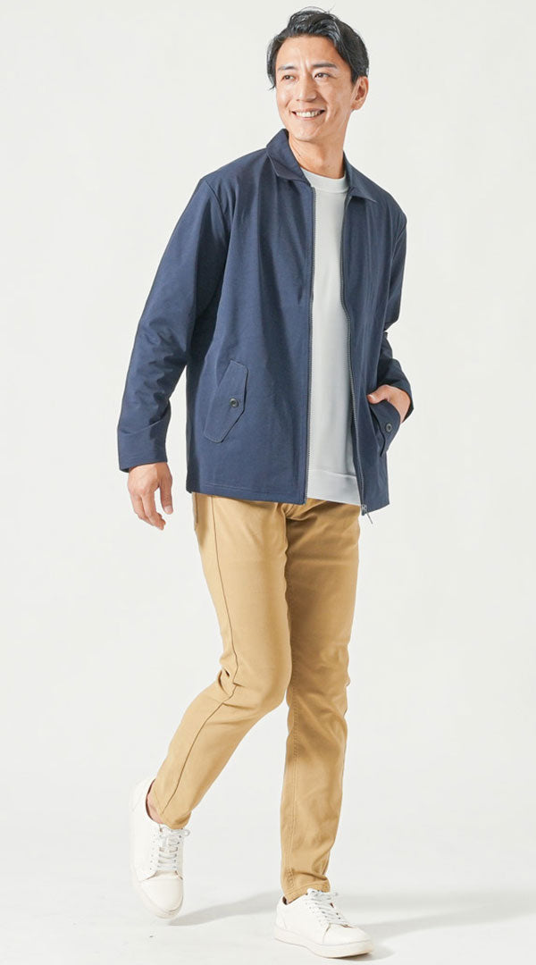 ネイビーブルゾンとベージュパンツの組み合わせが春らしい軽やかさと親しみやすさを演出。ネイビーとベージュは色温度差が大きく、コーデに柔らかさと季節感を加える好相性の配色。白スニーカーとライトグレーのインナーが抜け感をプラスし、爽やかな印象に。ネイビーに合うズボン選びで春コーデに映える1本として、明るめのベージュは特におすすめ。