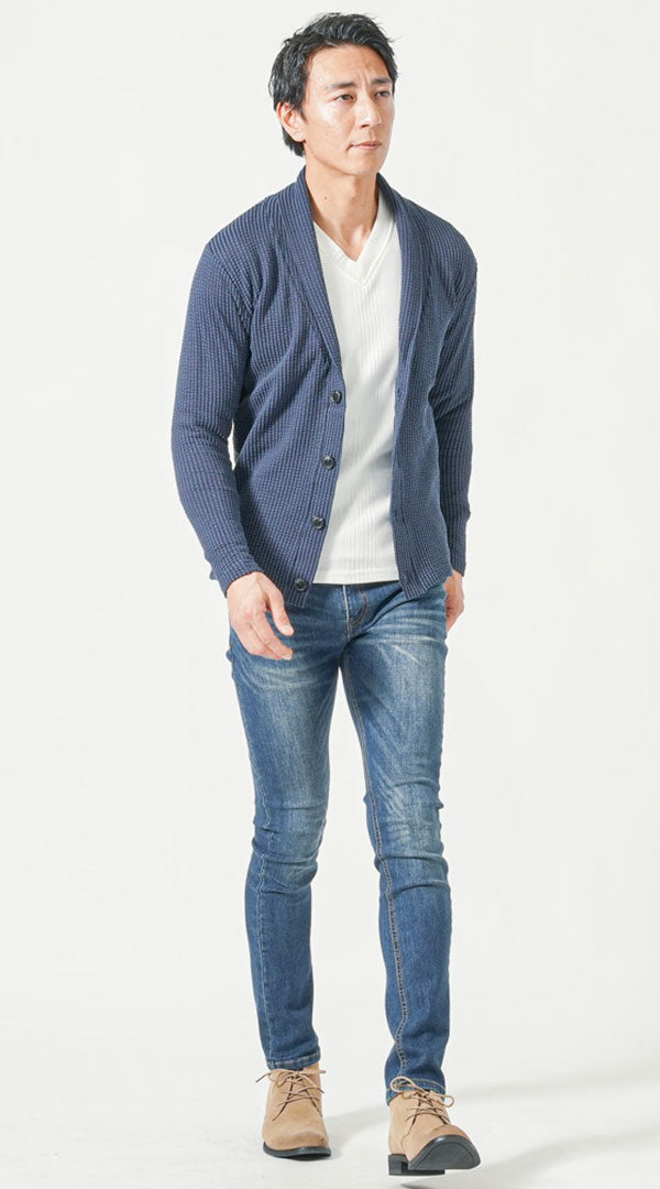 ネイビー×インディゴデニムパンツの実際のコーデ例