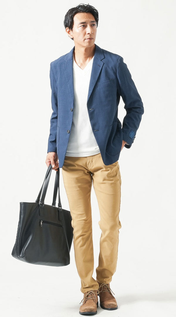 ネイビージャケットと明るめベージュパンツの組み合わせは、親しみやすさと上品さを両立した女子ウケ抜群のデートコーデ。色彩理論上、寒色のネイビーと暖色寄りのベージュは色温度差があり、柔らかさとメリハリを生む組み合わせ。白のVネックインナーで顔まわりを明るく見せ、全体を爽やかにまとめています。ネイビーに合うズボン選びで女性に好印象を与えたい時は、この配色がおすすめ。