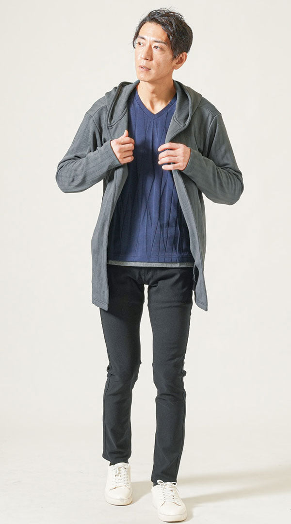 ネイビーのカットソーに黒パンツを組み合わせた、シンプルながらこなれ感のある休日スタイル。ネイビーと黒は暗色同士の近似色配色になるため、素材やシルエットの違いを活かすのがポイント。今回は立体感のあるパーカーとスリムなパンツラインで全体のバランスに差をつけ、都会的な雰囲気を演出。ネイビーに合うズボンの中でも、黒は大人っぽさとカジュアル感を両立できる便利な一色です。