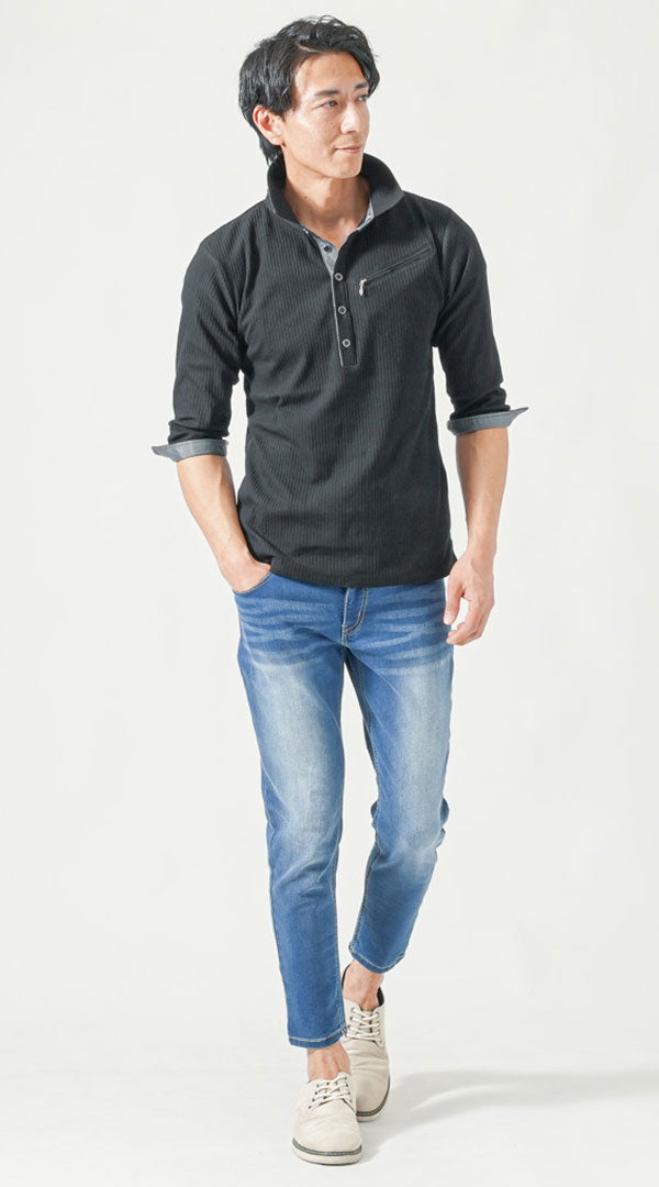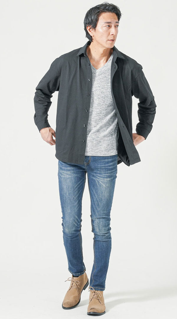 黒長袖シャツにグレー半袖VネックTシャツとネイビーテーパードデニムパンツを合わせた、少し肌寒さを感じる5月下旬の日におすすめの服装です。