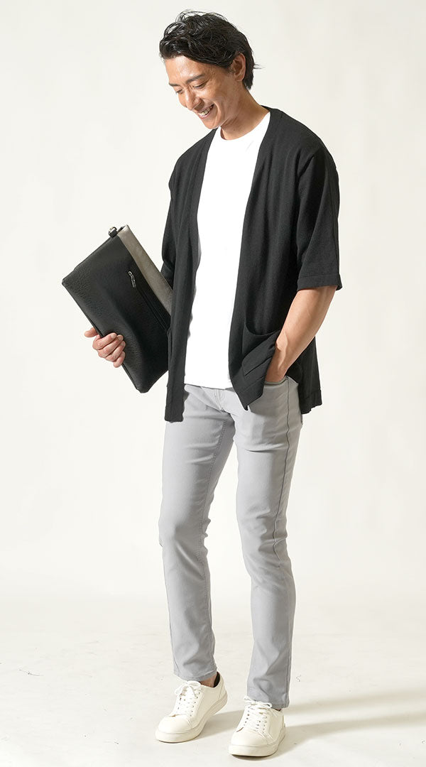40代メンズ3点コーデセット ダークブルー5分袖カーディガン×白半袖Tシャツ×黒スリムテーパードチノパンツ