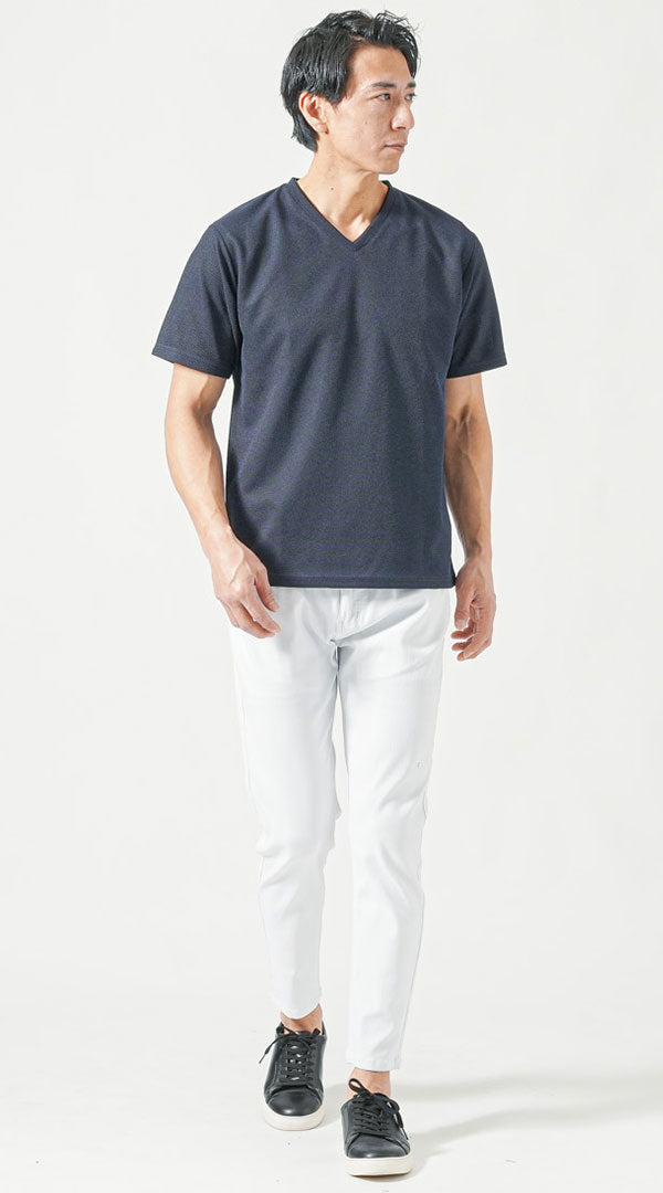 5月下旬の暑さの中でも涼しげに見せつつ、ネイビーのTシャツが大人の落ち着きを演出。
