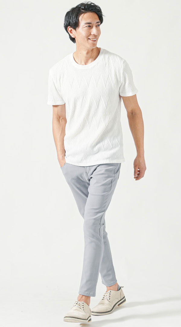 蒸し暑さを感じる5月下旬には、白Tシャツの爽やかさとグレーパンツの落ち着きが絶妙にマッチしたスタイルがおすすめです。