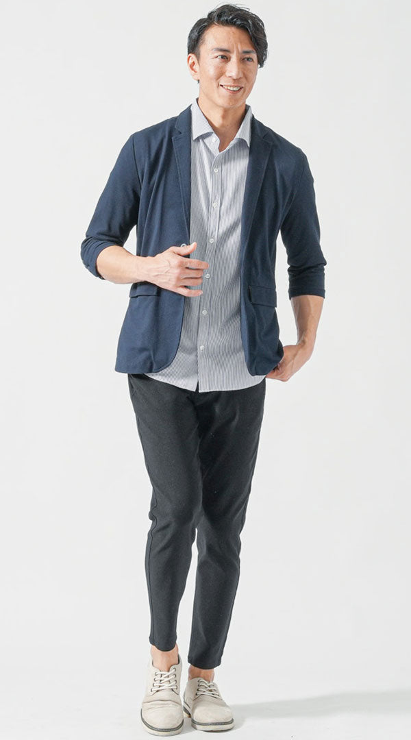 ネイビーの上品さと軽快な袖丈が、大人の余裕を感じさせます。