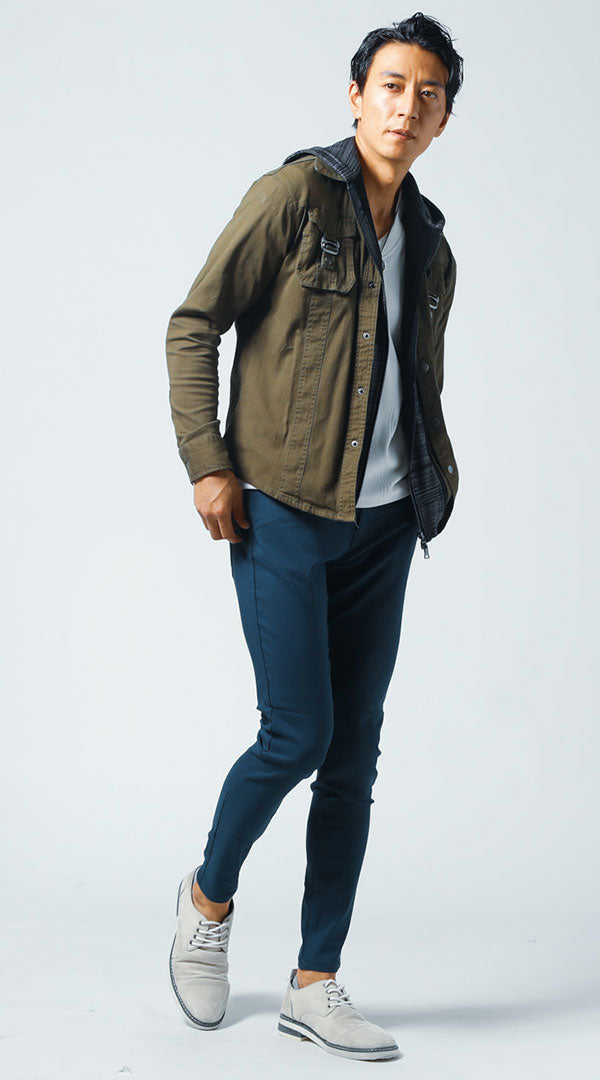 カーキ・オリーブ×ネイビーパンツの実際のコーデ例