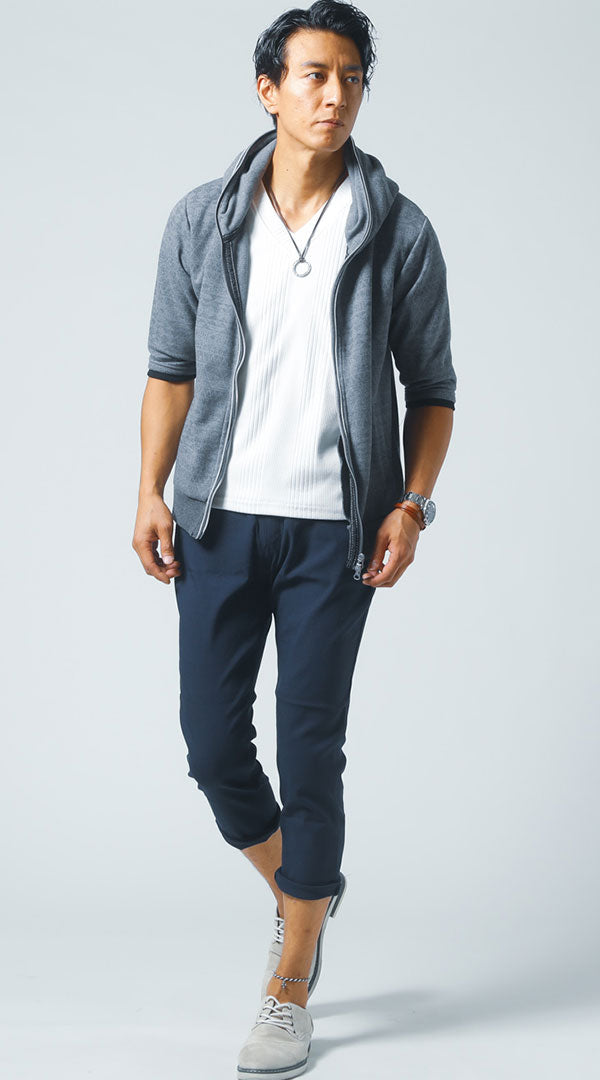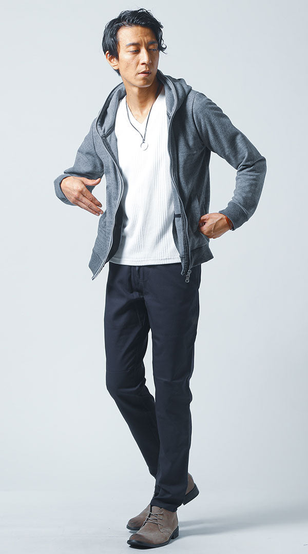 柔らかな印象のグレーパーカーに白インナーを合わせたカジュアルなトップスに、ネイビーパンツで大人っぽさをプラス。