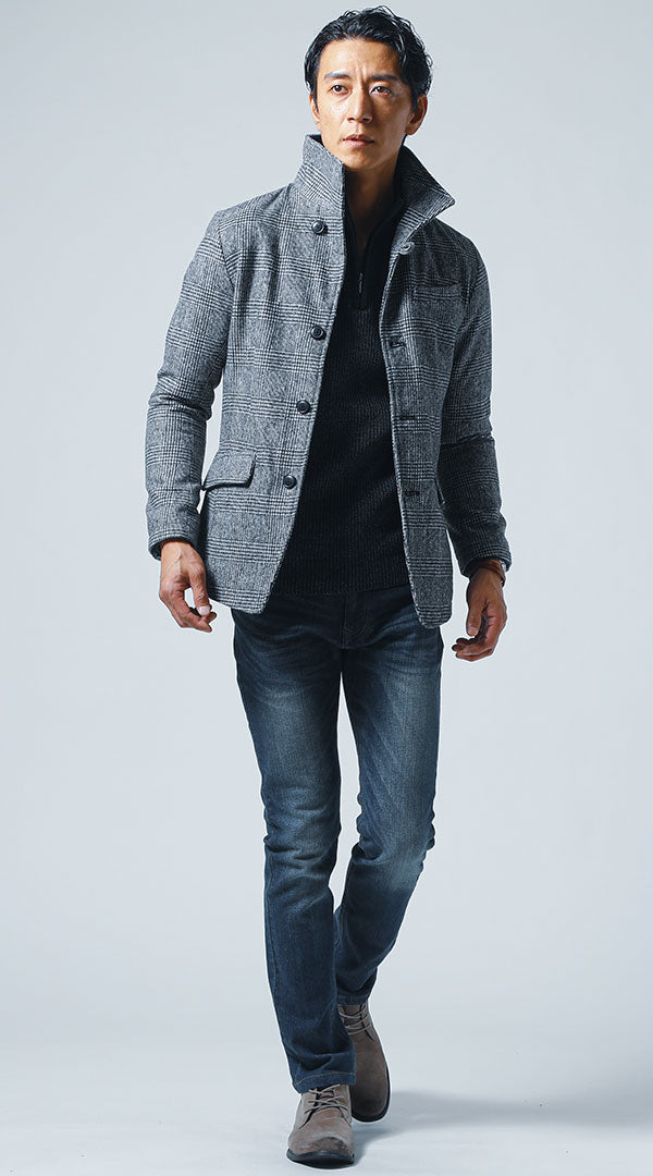 ネイビーデニムパンツにグレンチェック柄のスタンドカラーコートを合わせた冬の品格スタイル。