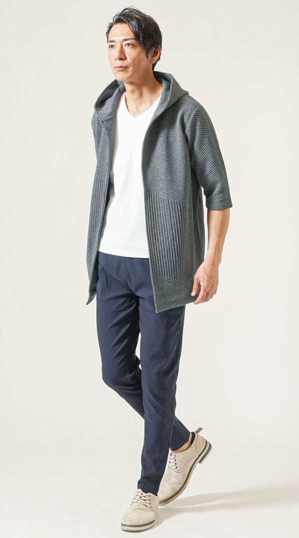 白×グレーの涼感レイヤードで作る、軽やかネイビーパンツスタイル