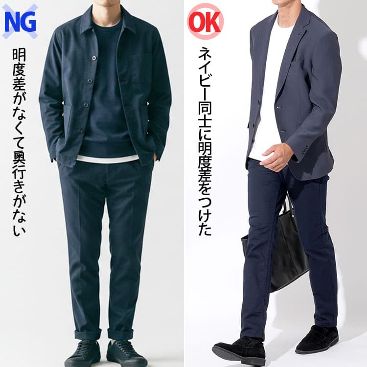 「反対に上下とも同じ濃いネイビーだと“セットアップ以外”ではのっぺりと見えるため、意識的な明度差作りが重要です。