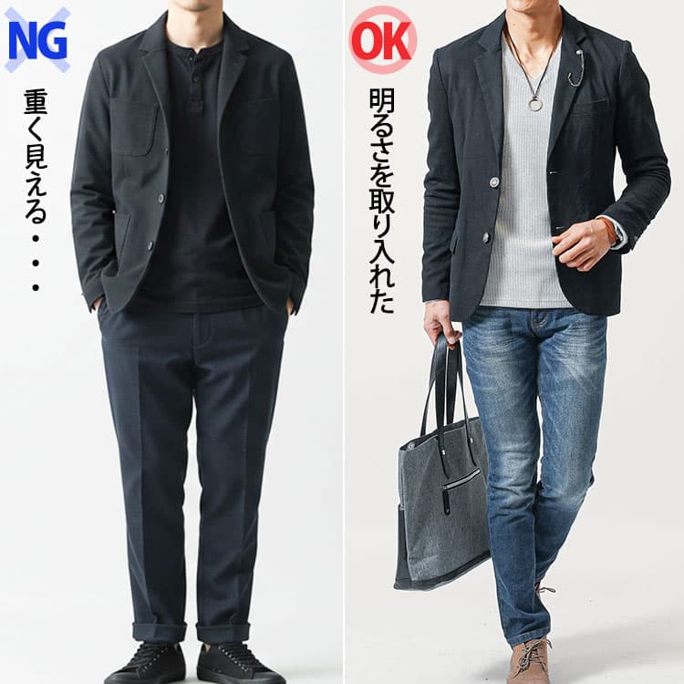 たとえば、薄めのネイビージャケットに濃いネイビーパンツを合わせることで奥行きが生まれます。