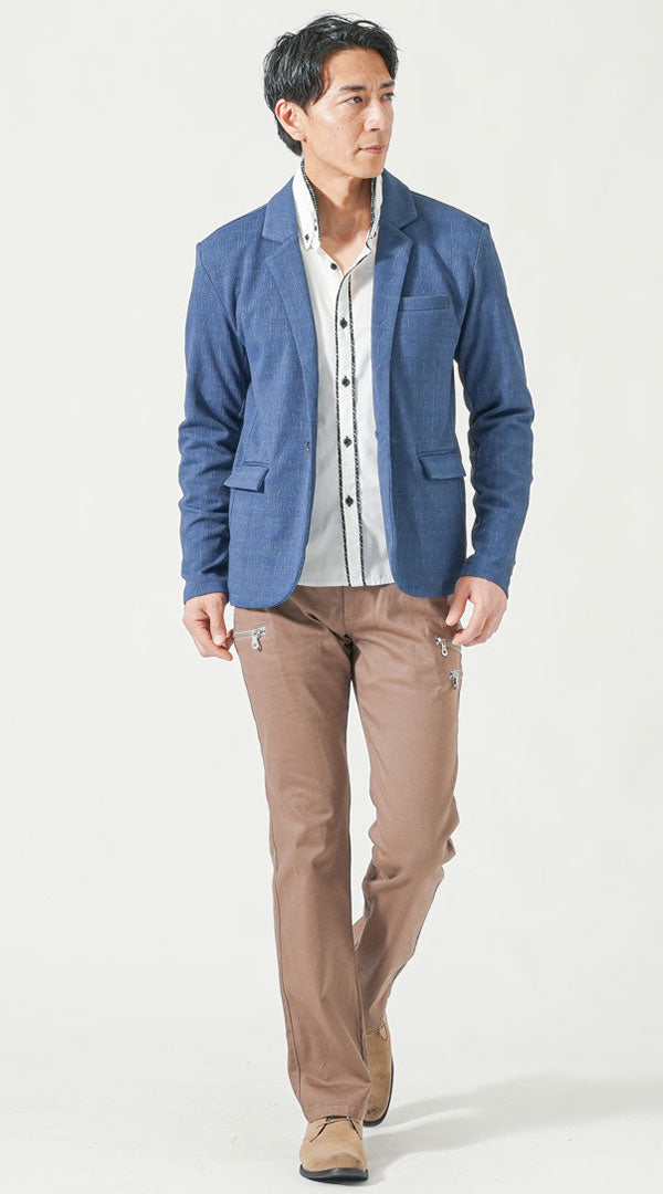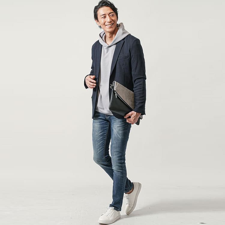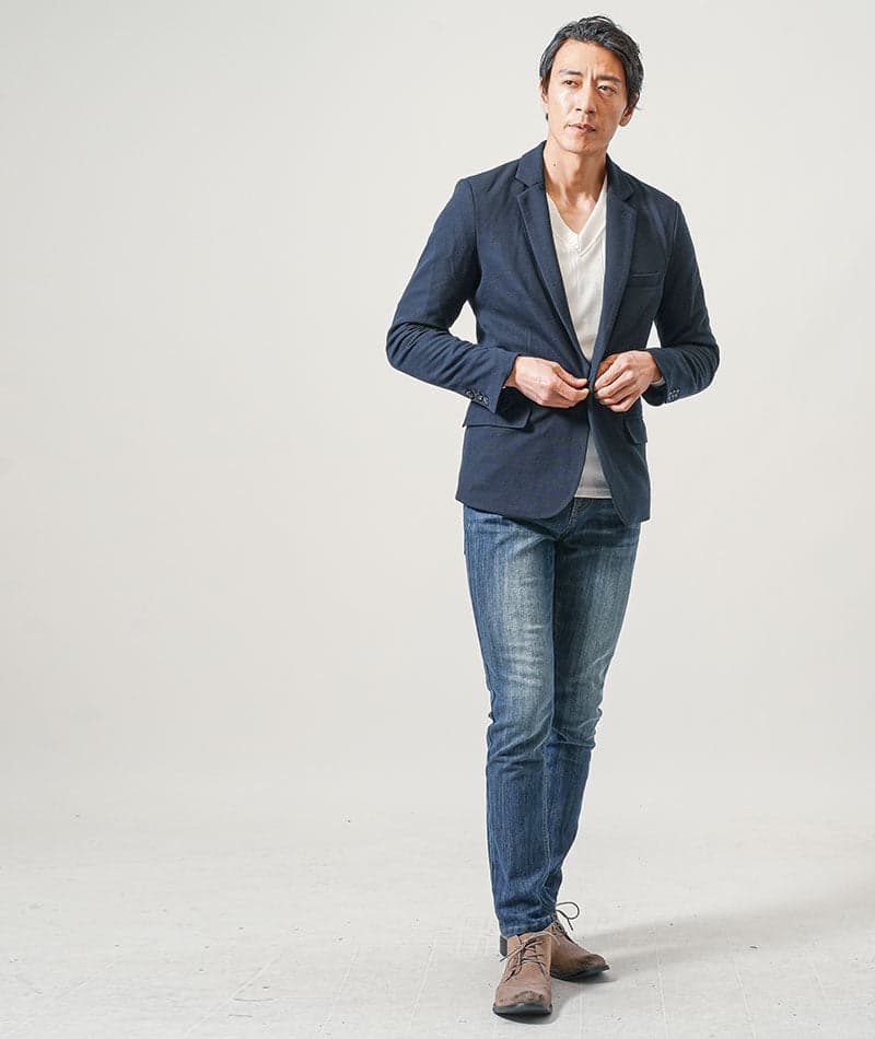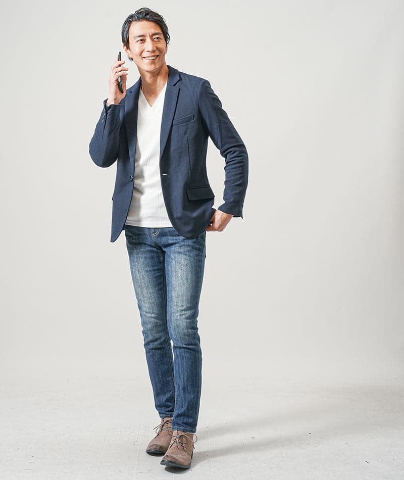 さらに、リラックス感を求めるなら、デニムパンツを合わせてネイビージャケットをカジュアルダウンすると良いでしょう。