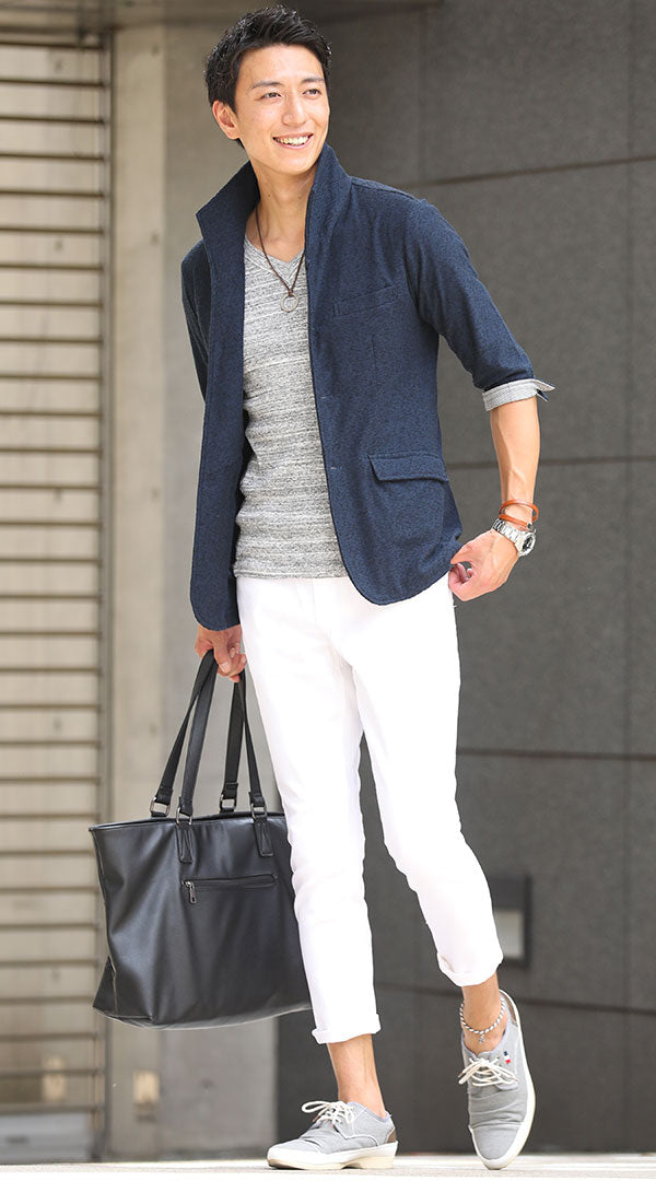 白・グレーインナーと合わせたメンズのネイビージャケットコーデ紹介