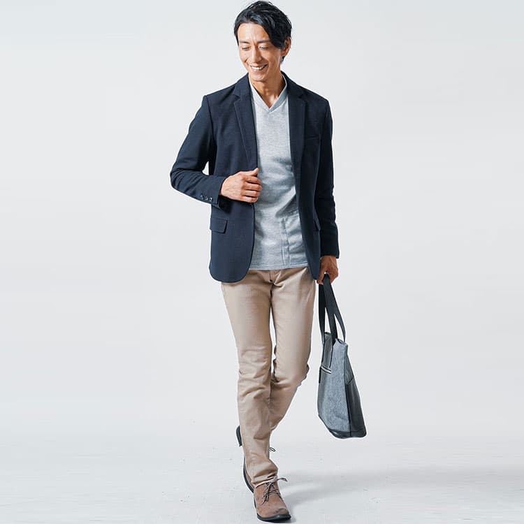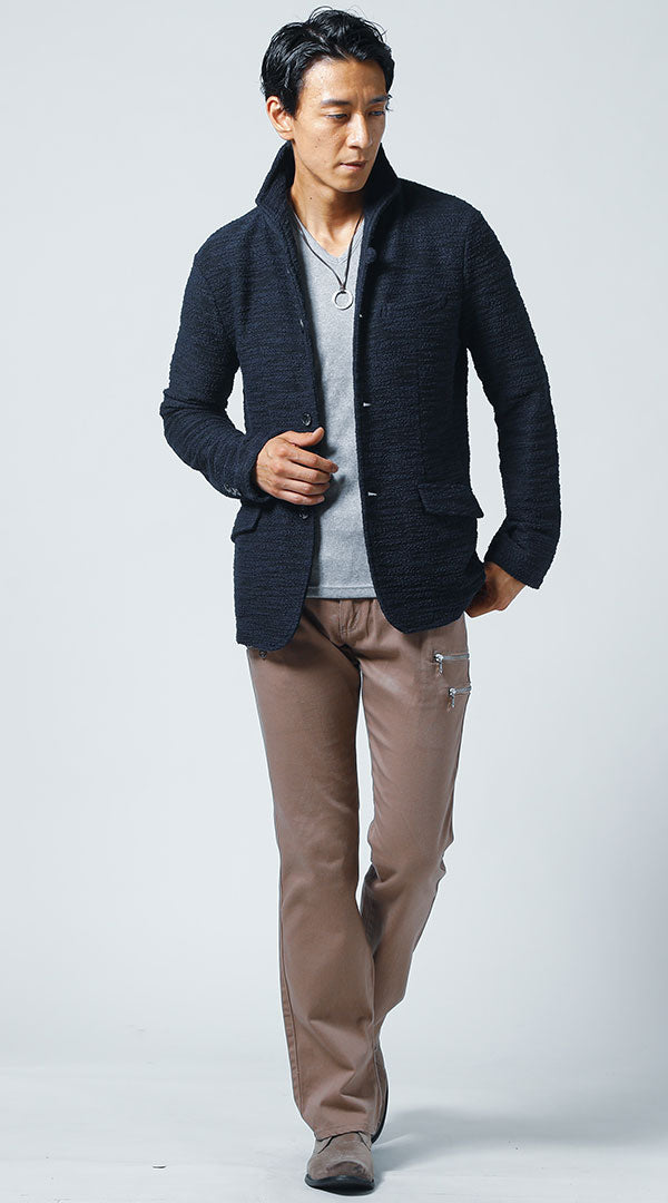 ■ネイビージャケットに合うグレーインナーを合わせたコーデ例