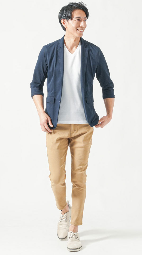 40代メンズ3点コーデセット ネイビー長袖テーラードジャケット×白長袖Tシャツ×ベージュスリムチノパンツ