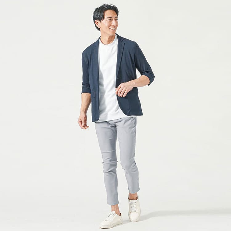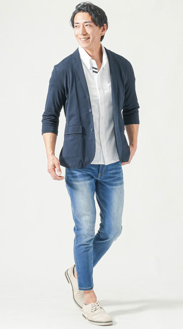 ■ネイビージャケットに合う白インナーを合わせたコーデ例