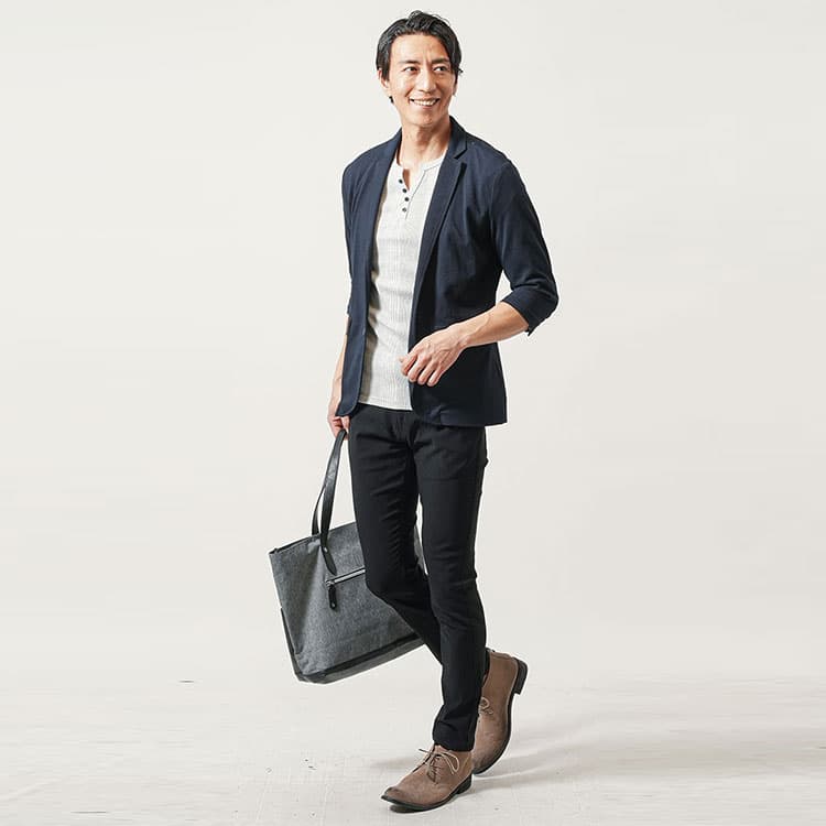 20代におすすめのネイビージャケット×黒Tシャツコーデ例