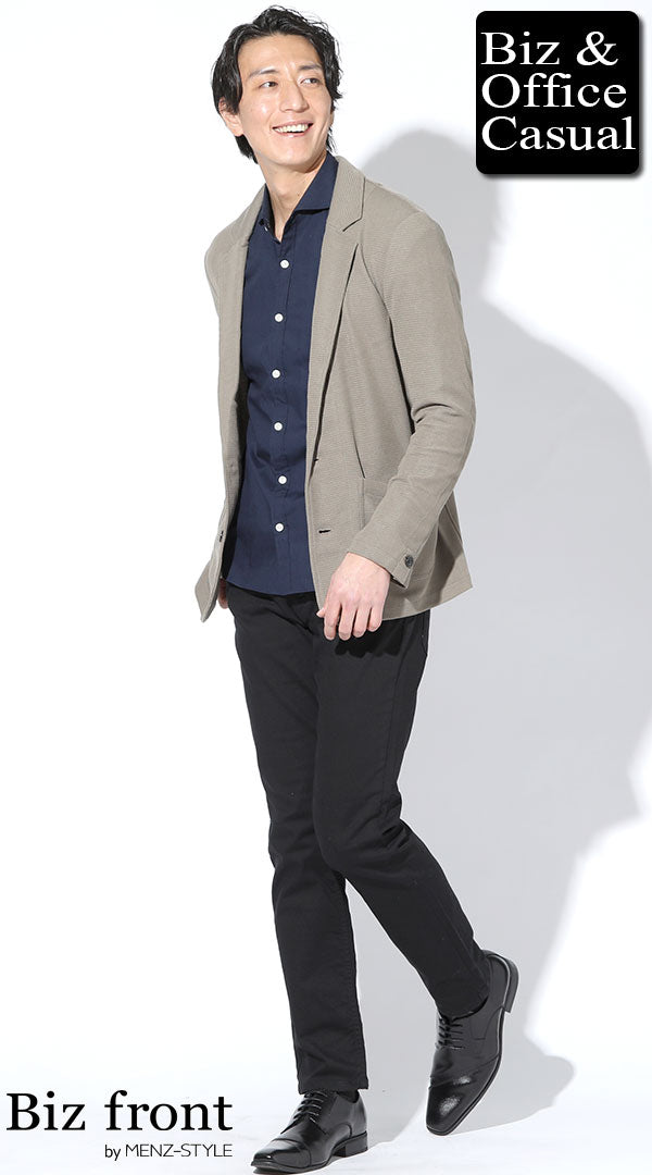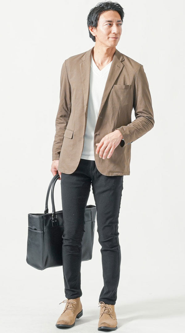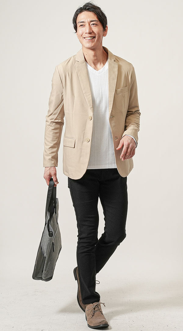 【ビジネスカジュアル編】ベージュジャケットに合う黒パンツコーデ紹介
