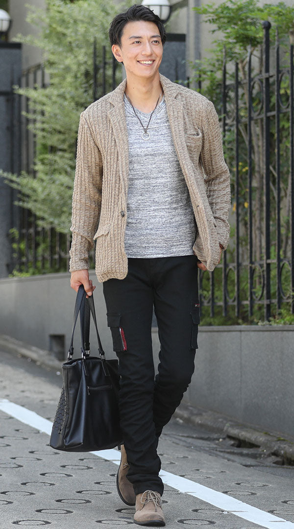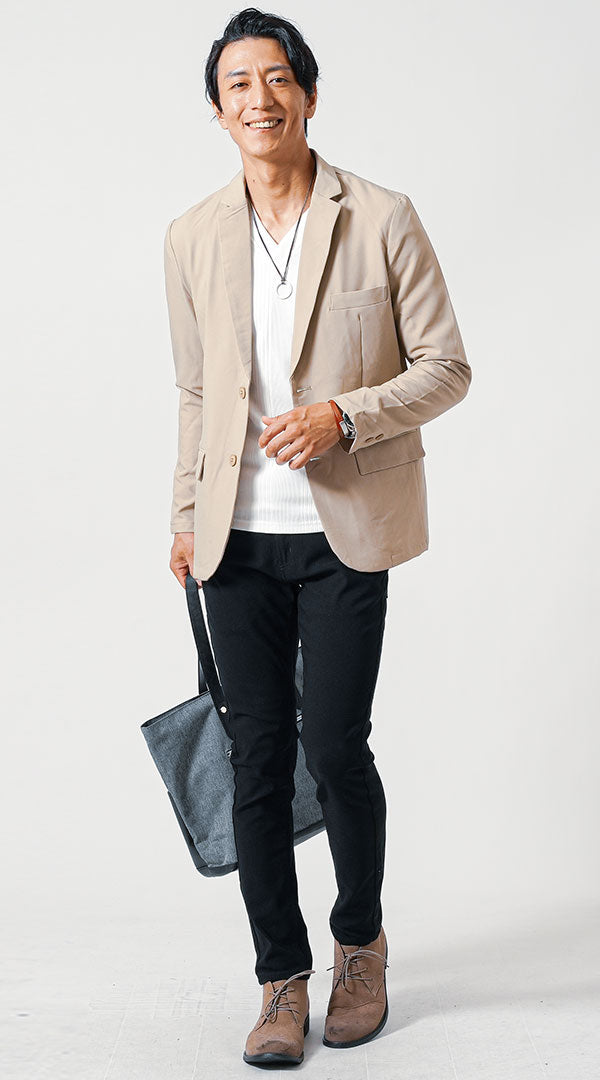 ベージュジャケット×黒パンツのメンズコーデ例
