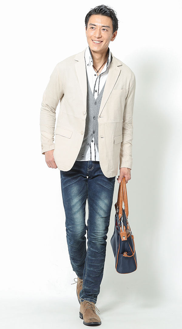 ベージュジャケット×デニムパンツのメンズコーデ例