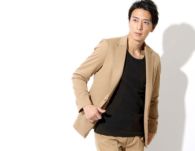 さきほどは定番のTRと呼ばれるスーツのような素材で、今回は「カット素材」を使った柔らかい素材のベージュジャケット