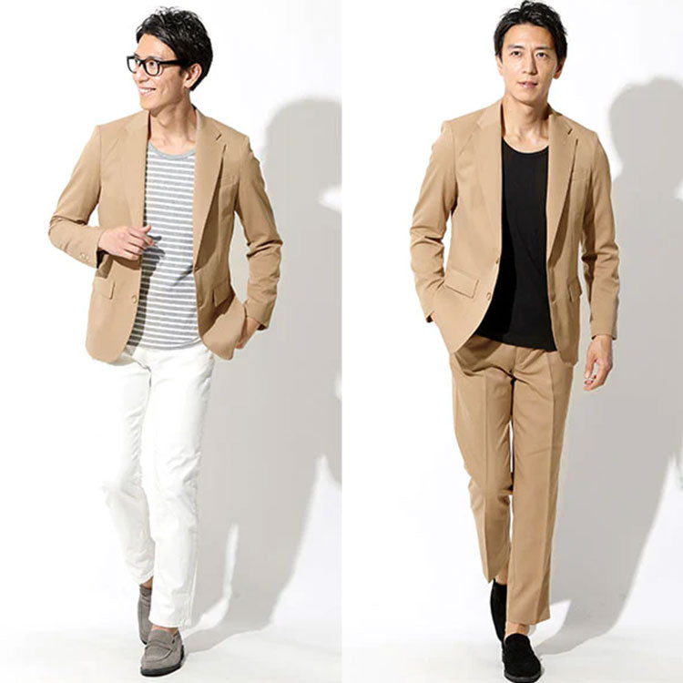 なぜあえて同じ色のパンツのジャケットコーデを紹介したかというと、カット素材のジャケットのほうか身体にフィットして、よりスタイルよく見せることができるようになります。
