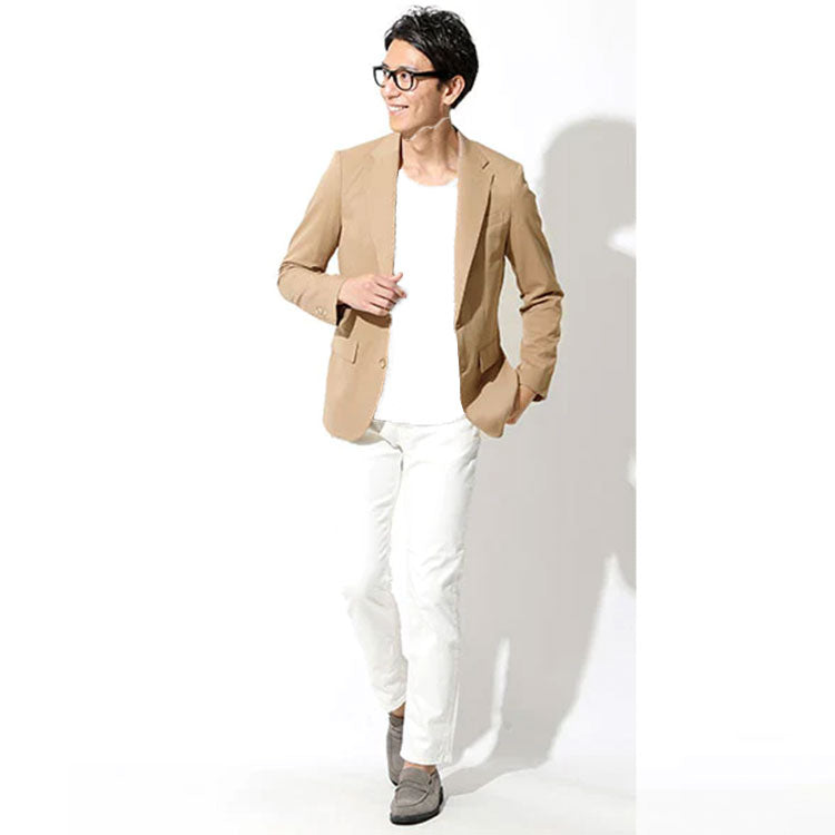 上品さのあるベージュジャケットは大人のメンズだからこそ取り入れたいアイテムです。