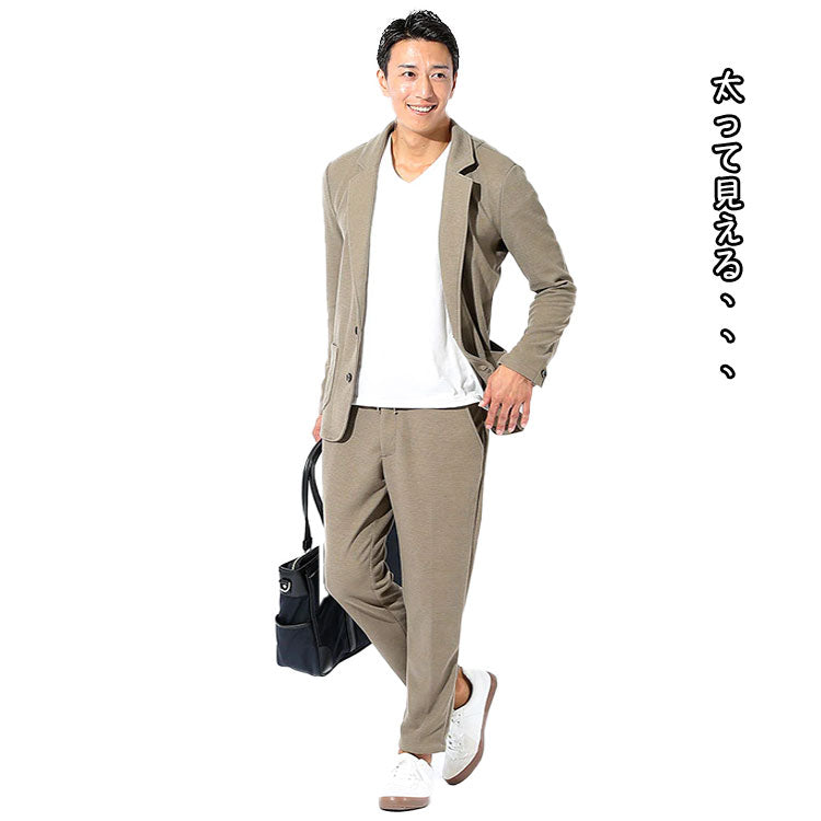 なので最近多い、「ベージュジャケット×ベージュパンツ」というメンズコーデであるセットアップをすると、少し太って見える