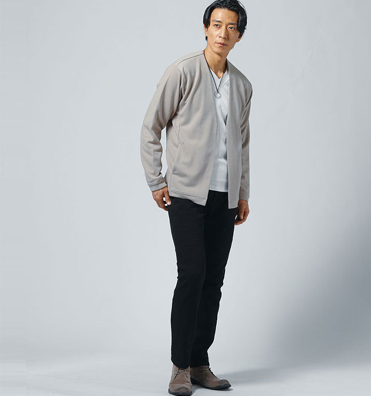 ベージュノーカラージャケット×黒パンツコーデ