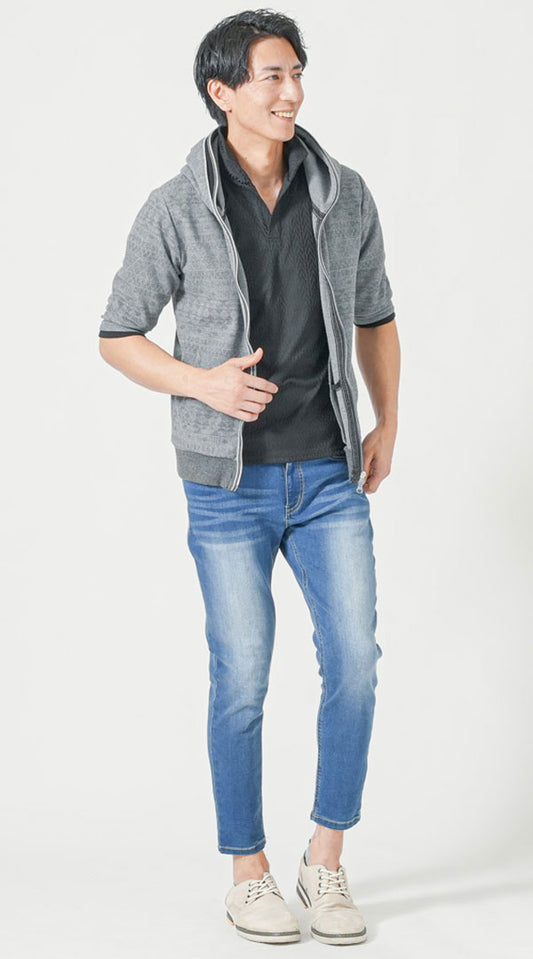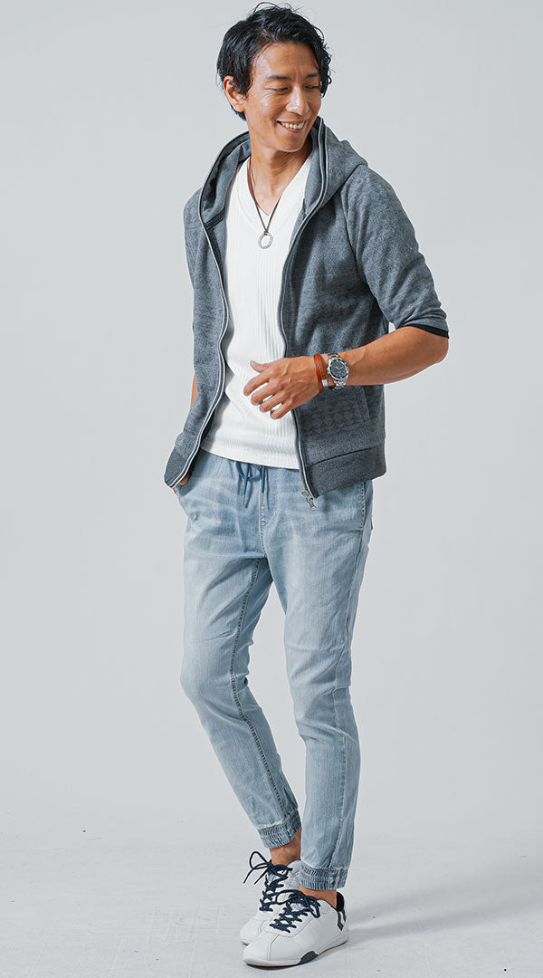 ライトブルーデニムは色が薄いため、全身淡色だとメリハリがなくぼやけた印象に。このコーデではグレーパーカーを羽織ることで、コーデ全体に中間色の引き締めを加えています。シンプルながらも白×グレー×ライトブルーの3色構成で、色のバランスも良好。ダサ見えを回避しつつ、清潔感のある夏のカジュアルスタイルに仕上がっています。