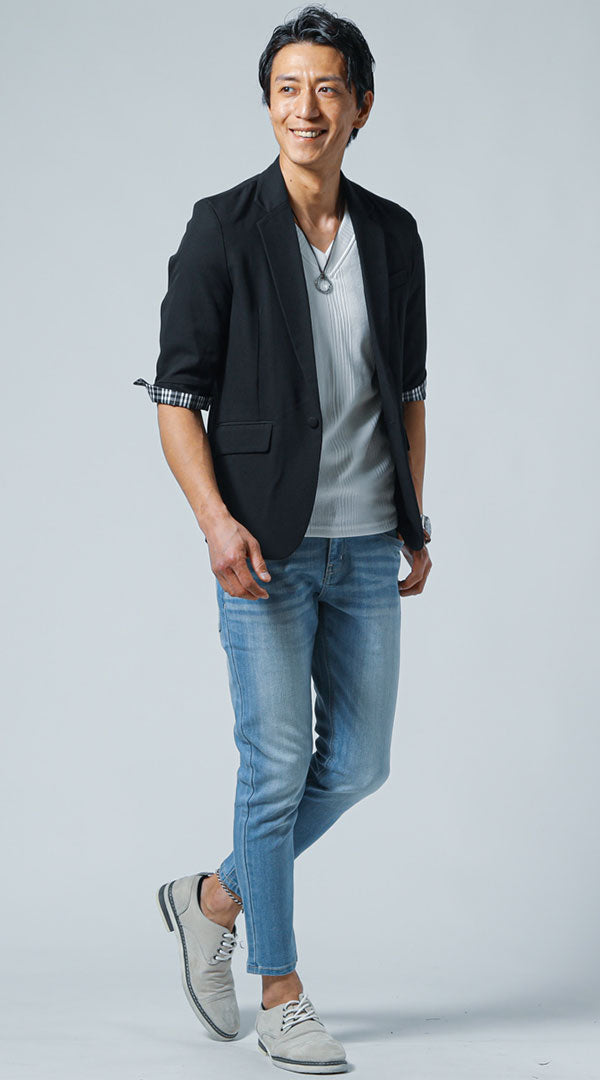 “カジュアルすぎてダサい”を防ぐには、きれいめなトップスの投入が効果的。このコーデは白のリブTにテーラードジャケットを重ね、ライトブルーデニムを程よくドレスアップ。アンクル丈とグレースエードシューズで足元にも抜け感と品を持たせ、大人のスマートカジュアルに仕上げています。