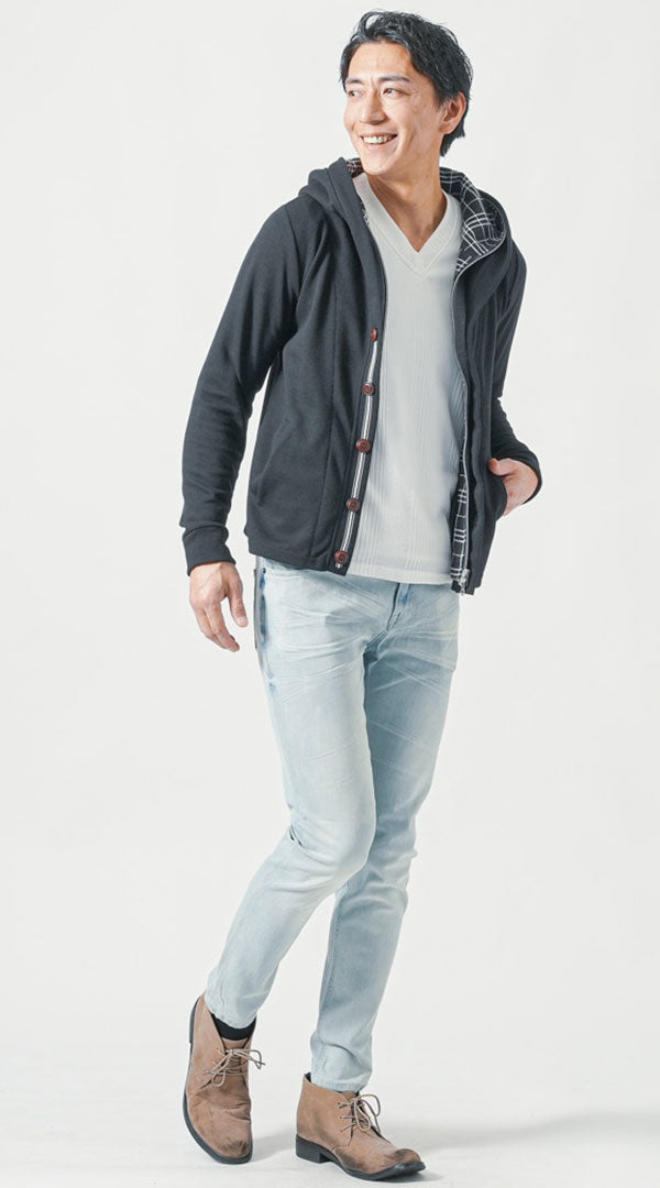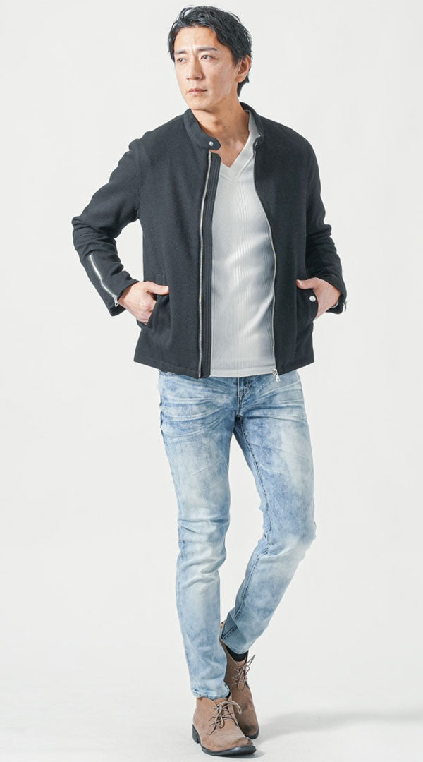 強めのウォッシュ加工があるライトブルーデニムは、着こなしを間違えると「若作り感」が出やすいアイテム。ここではリブ入り白Tと黒のノーカラーブルゾンを合わせ、清潔感と大人っぽさをプラスしています。土臭くなりすぎないベージュブーツが上品さを添え、バランスの取れた男らしいコーデに。