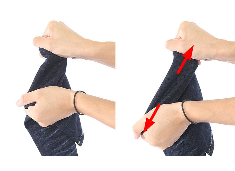 干す前に、ウエスト部分や膝回りなどを中心に縦横に引っ張ってシワを伸ばし形を整えます。