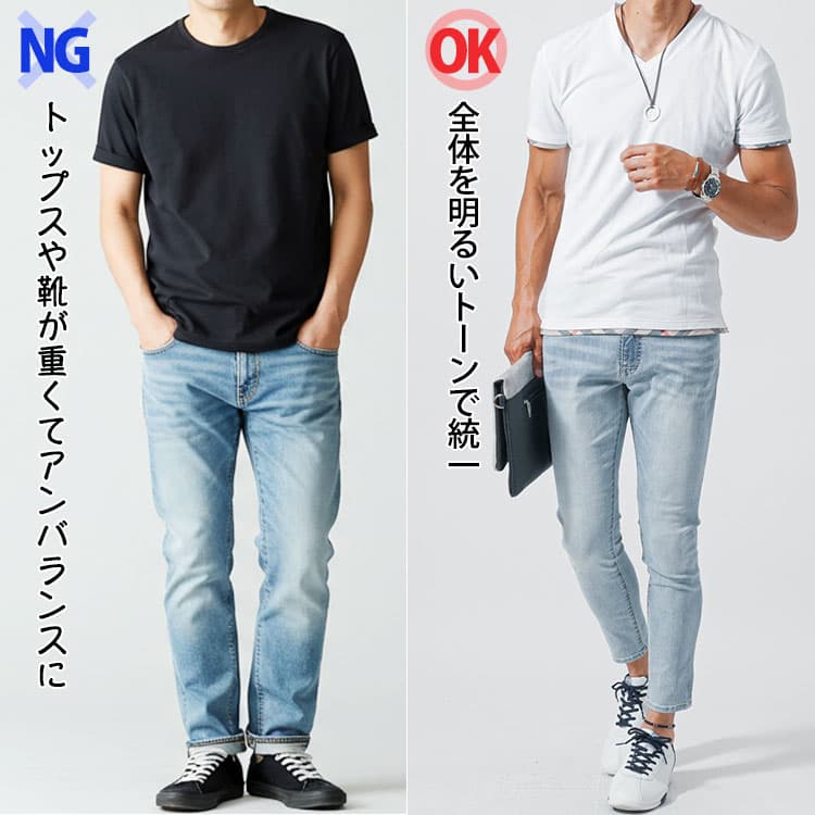 トップスや靴が重めな配色のままだと、下半身だけが妙に明るく目立って見えるため、自信のない人ほど「これはおれには似合わない」と誤解しやすいのです。