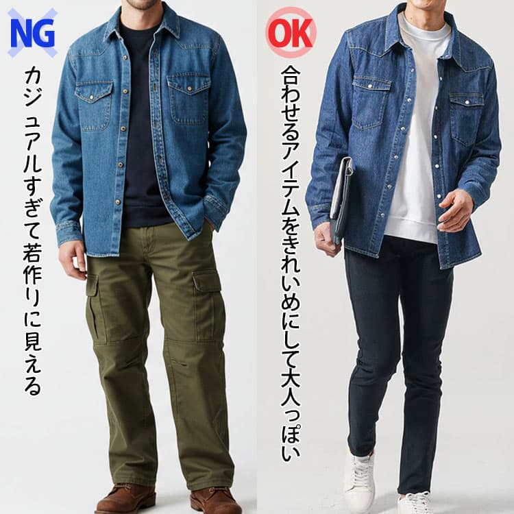 デニムシャツは、それ単体では大人っぽくも着られるアイテムですが、合わせる服によっては「若作り感」が前面に出てしまいます。特に太めのカーゴパンツやごつめのスニーカー、アウトドア風の小物などを合わせてしまうと、無骨さが強調されすぎてしまい、特に40代以上の男性には“頑張ってる感”が出てしまうのです。